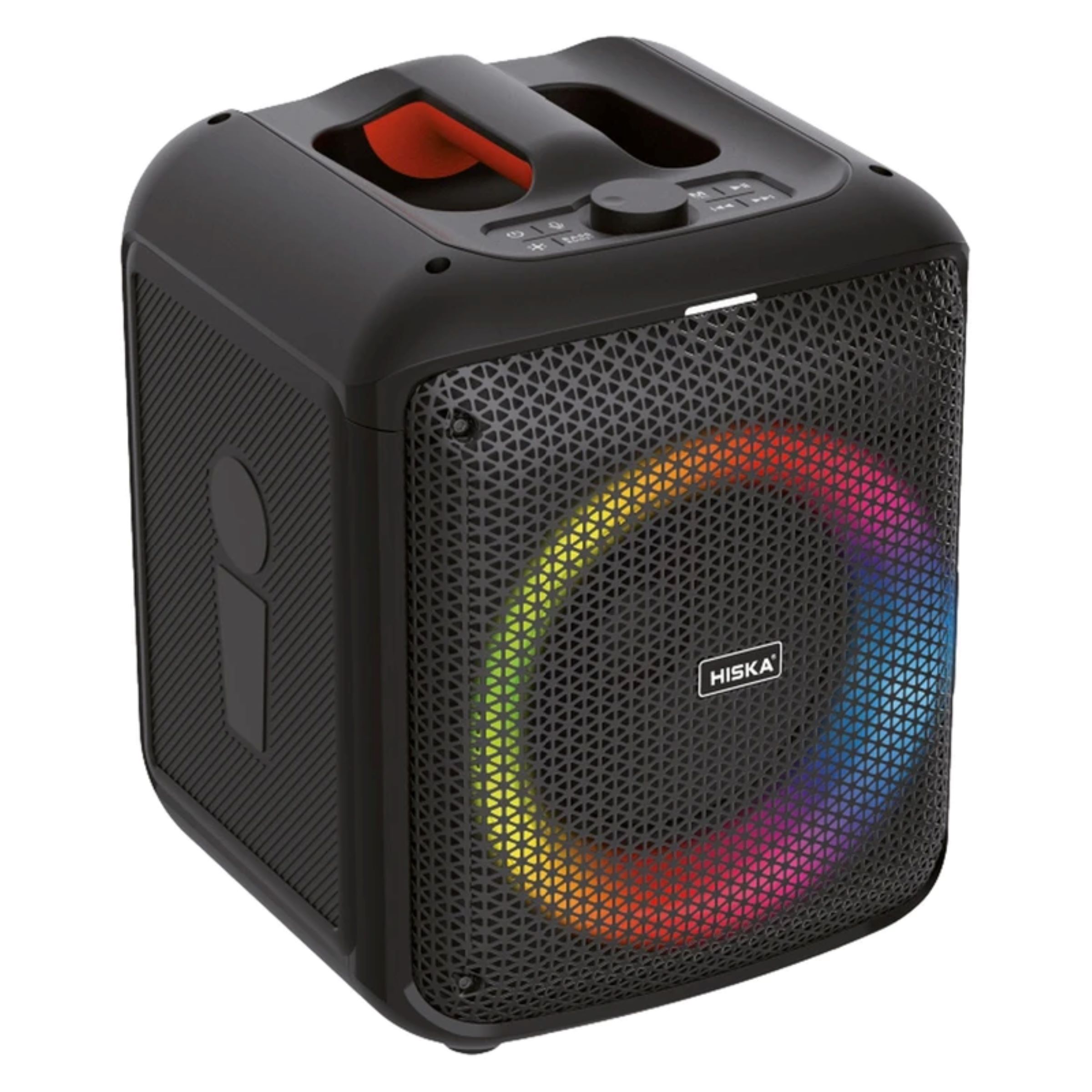 کوچک ترین ورژن اسپیکرهای پارتی باکس هیسکا مدل B175 است. هیسکا تلاش کرده است تا برای همه سلیقه ها یک محصول مناسب داشته باشد. این اسپیکر برای افرادی است که دوست دارند در جمع های کوچک و دوستانه به صورت جمعی موسیقی گوش دهند یا بتوانند با صدای بهتری فیلم تماشا کنند. علاوه بر این دوست ندارند که این اسپیکر فضای زیادی را اشغال کند. اسپیکر پارتی باکس B175 با وجود ابعاد کوچک نسبت به سایر اسپیکرها اکثر قابلیتهای مدلهای بزرگتر آن را دارا است. در بخش طراحی یک اسپیکر قابل حمل با طراحی جذاب را میتوانید مشاهده کنید. ابعاد این اسپیکر 329x283x264 میلیمتر و وزن آن نیز 4200 گرم است. بخش بالای آن نیز یک دسته محکم قرار دارد که با این ساختار به راحتی میتوانید آن را حمل کنید. بدنه این اسپیکر از استحکام خوبی برخوردار است. بنابراین مشکلی برای جابه جایی این اسپیکر نخواهید داشت. این اسپیکر قابلیت نورپردازی نیز دارد. با توجه به ابعاد، تعداد LED های کمتری روی آن قرار دارد اما قابلیت های همیشگی روی این اسپیکر موجود است. شما میتوانید با دکمه مخصوص نورپردازی که روی اسپیکر قرار دارد مدلهای مختلف نورپردازی را انتخاب کنید. با وجود این که پارتی باکس B175 کوچکترین مدل سری اسپیکرهای پارتی باکس است اما میتوانید توقع صدایی با وضوح بالا مانند سایر مدل های آن را داشته باشید. این اسپیکر قابلیت پخش صدای 40 واتی را دارد. برای مهمانیهای کوچک این اسپیکر کاملا مناسب است اما اگر بخواهید صدای بیشتری را در محیط احساس کنید قابلیت TWS به کمک شما میآید. با این قابلیت میتوانید از طریق کلید TWS روی خود اسپیکر قرار دارد میتوانید اسپیکر دوم را به صورت وایرلس متصل کند. یک دکمه کاربردی دیگری که روی سیستم قرار دارد دکمه BASS BOOST می باشد که حالتهای مختلف باس اسپیکر را میتوانید به وسیله آن تنظیم کند. قابلیت هیجان انگیزی که در این اسپیکر موجود است قابلیت نورپردازی آن است. LED های موجود روی اسپیکر هیسکا مدل B175 همزمان با ریتم آهنگ تغییر میکند و فضای جذاب تری را برای شما ایجاد میکند. که این نورپردازی را از طریق دکمه ای که روی دستگاه وجود دارد می توانید حالت های مختلفی را مشاهده کنید. و به وسیله باتری 6000 میلی آمپر ساعتی خود، با یکبار شارژکردن می توانید تا 4 ساعت بی وقفه به موسیقی مورد علاقه تان گوش دهید.